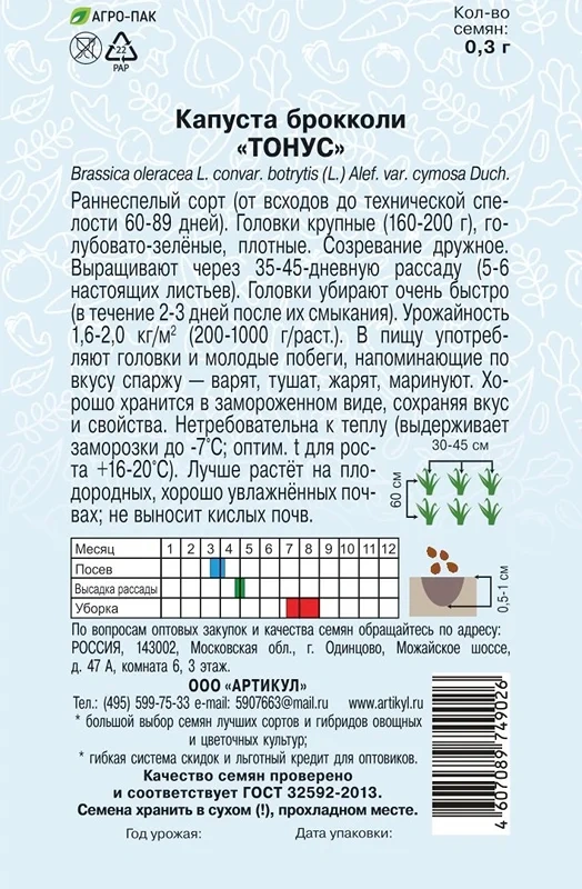 Семена Артикул Капуста Брокколи Тонус, 10г