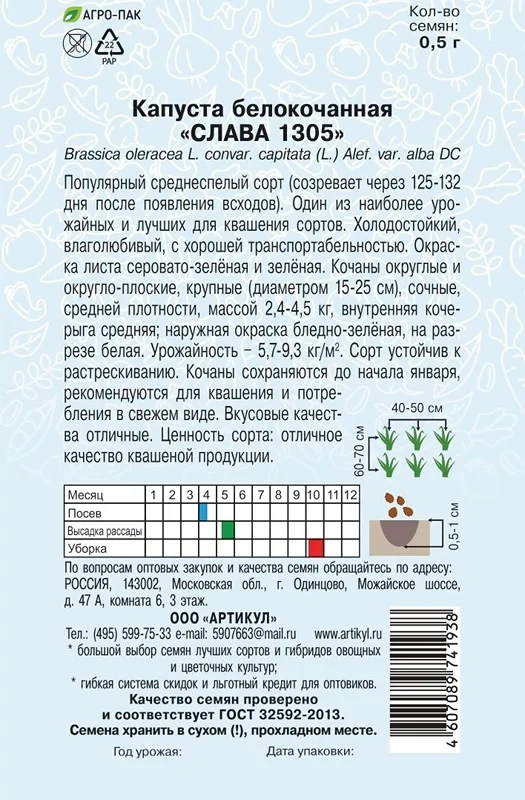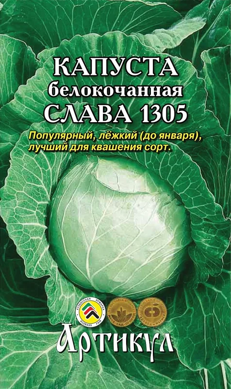 Семена Артикул Капуста Белокочанная Слава 1305, 10г