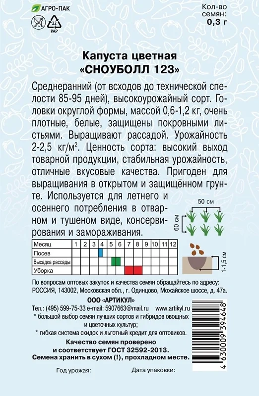 Семена Артикул Капуста Цветная Сноуболл 123, 10г