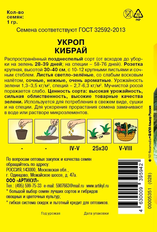 Семена Артикул Дисплей 36 эконом укроп кибрай