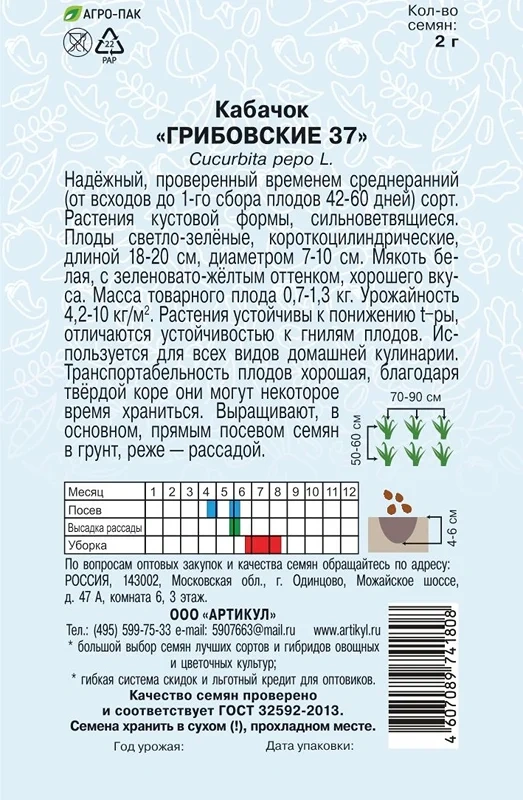 Семена Артикул Кабачок Грибовские 37, 10г
