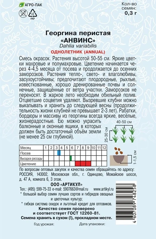 Семена Артикул Георгина Перистая Анвинс, 10г