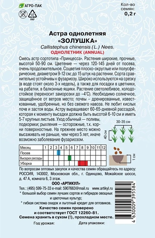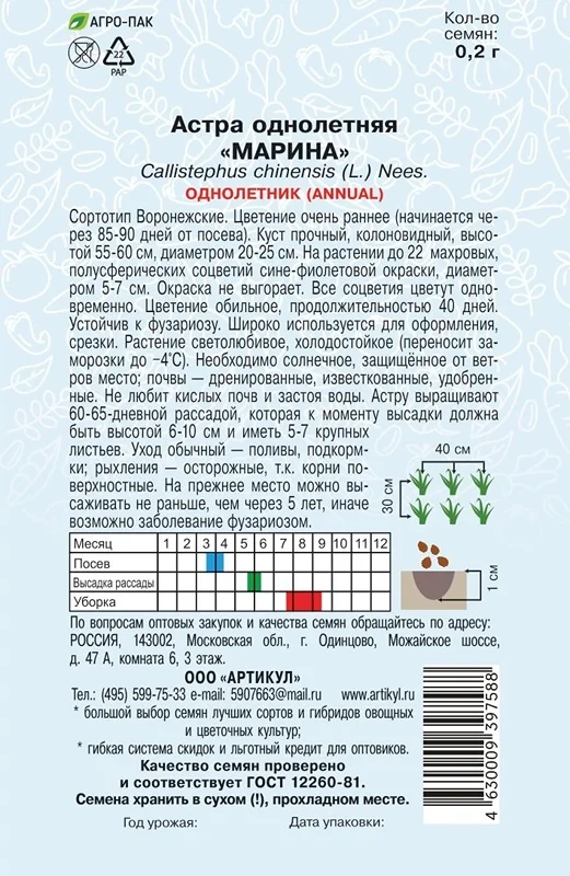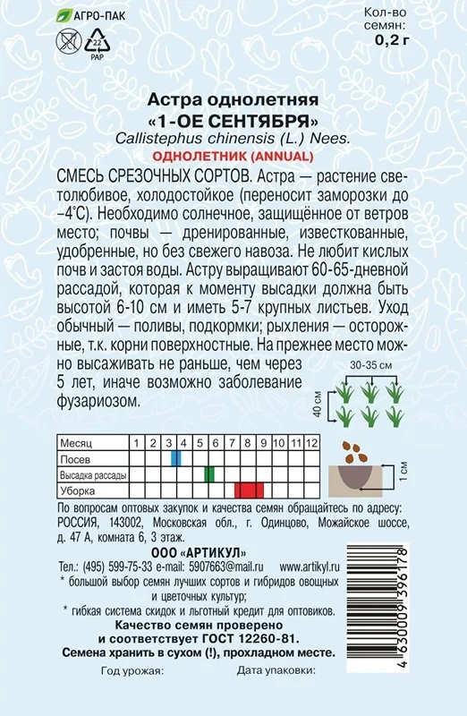 Семена Артикул Астра однолетняя 1-Е Сентября, 10г