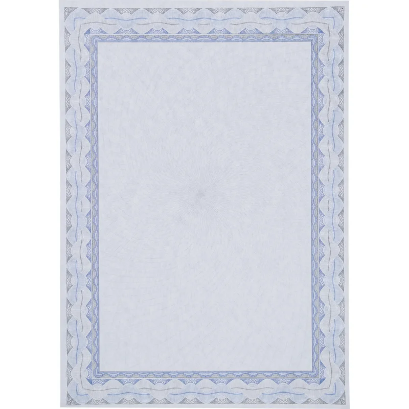 Сертификат-бумага А4 Attache 50 шт/уп синяя рамка спираль ID5 Сертификат-бумага предназначена для печати сертификатов, грамот и дипломов на любых принтерах. Изготавливается из офсетной бумаги. Формат А4, в пачке 50 листов, плотностью 120 г/кв.м, с рамкой синего цвета.
