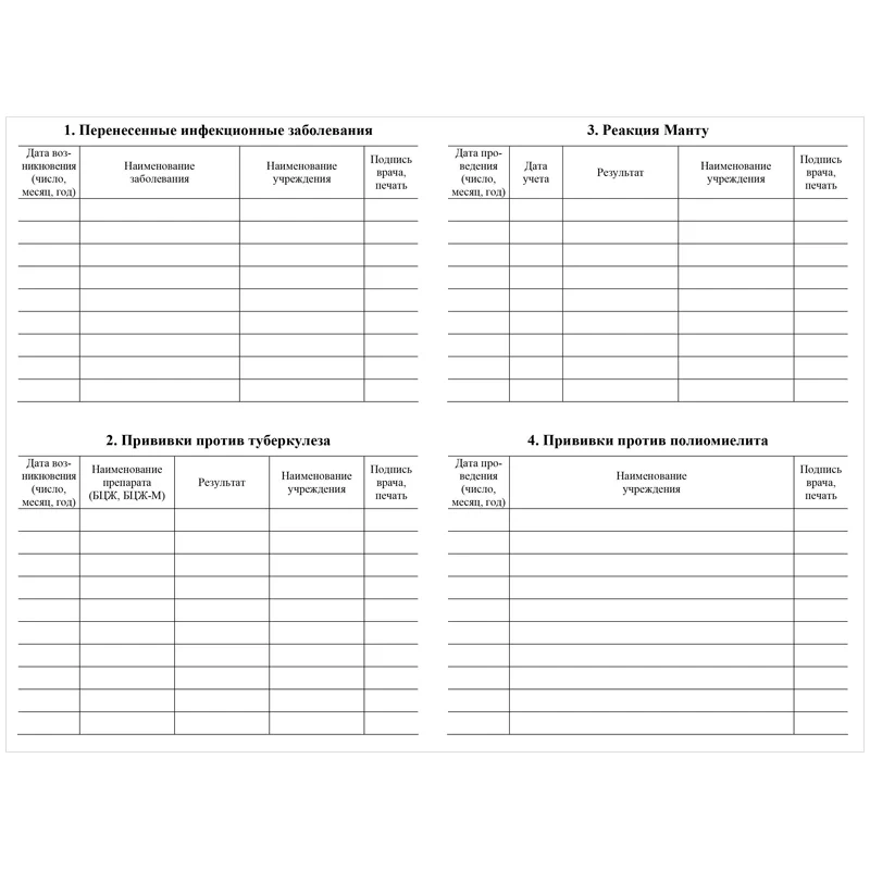 Книга для учета профилактических прививках. Обложка - бумага офсетная плотностью 120 г/м2. Внутренний блок - офсетная бумага плотностью 65 г/м2. Вид крепления - скрепка