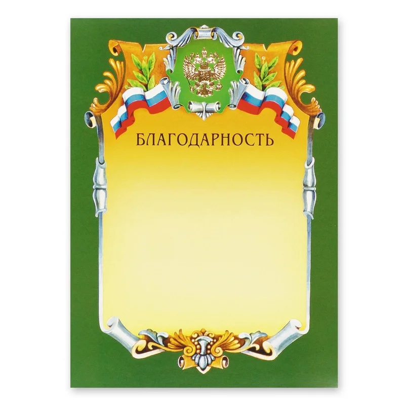 Благодарность А4, герб с триколором, зеленая рамка