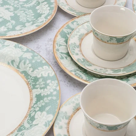 Изготовлен из высококачественного фарфора и предназначен для сервировки стола на 6 персон. Каждый элемент сервиза украшен изысканным орнаментом и декорирован золотой каймой, что придает ему особый шарм и элегантность. В комплект входят: 6 больших тарелок для главного блюда, 6 суповых тарелок, 6 десертных тарелок, 6 чашек для чая или кофе, 6 блюдец для чашек. Специальное покрытие и качественный материал позволяют использовать посуду долгое время, без потемнений, стираний рисунка, сколов. Не подходит для СВЧ-печи и посудомоечной машины.