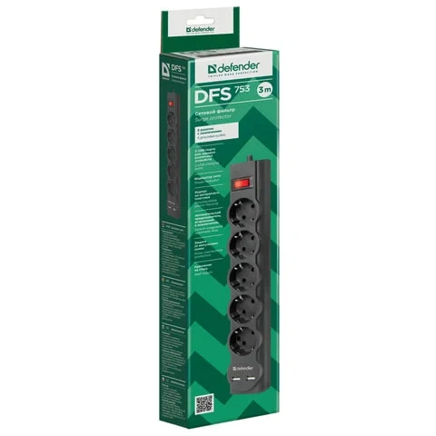 Сетевой фильтр Defender DFS-753 5 розеток, 3м, черный, 2 разъема USB