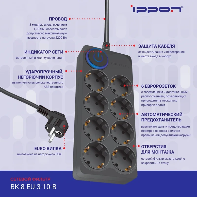 Сетевой фильтр Ippon BK-8-EU-3-10-B 3м (8 розеток) черный (коробка)