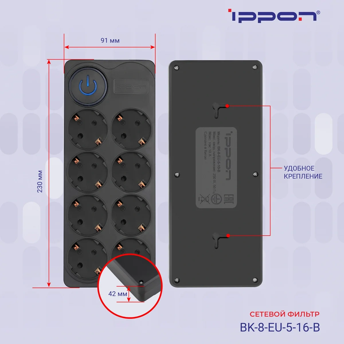 Сетевой фильтр Ippon BK-8-EU-5-16-B 5м (8 розеток) черный (коробка)