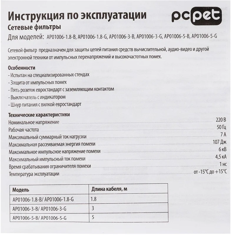 Сетевой фильтр PC Pet AP01006-1.8-G 1.8м (5 розеток) серый (пакет ПЭ)