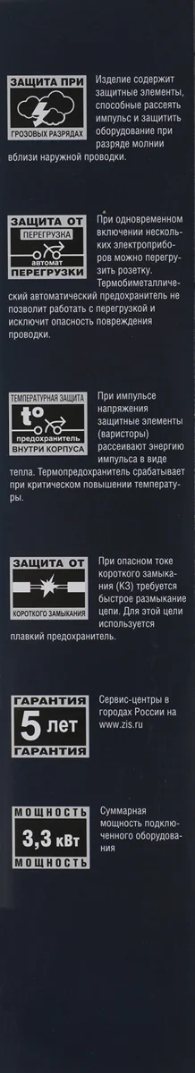 Базовая модель, в которой реализованы самые необходимые функции для защиты бытовой и офисной техники. Обладает 4 евророзетками и длиной провода 5 метров.
