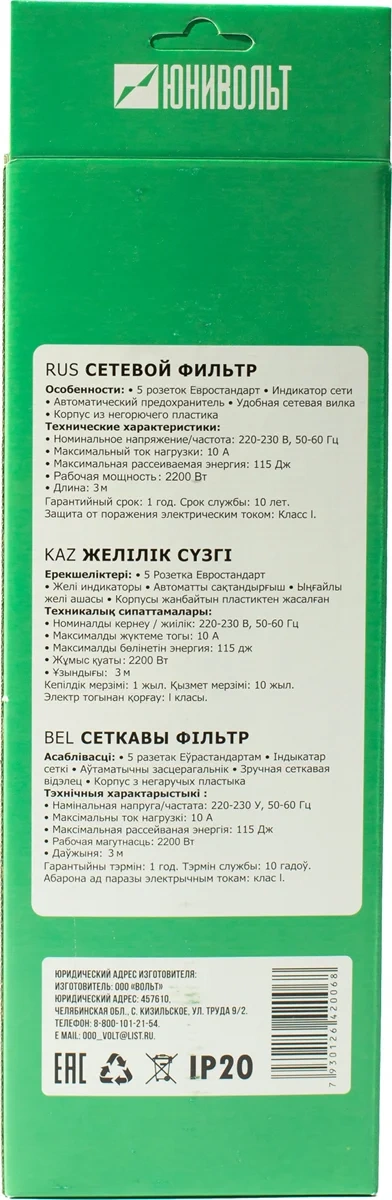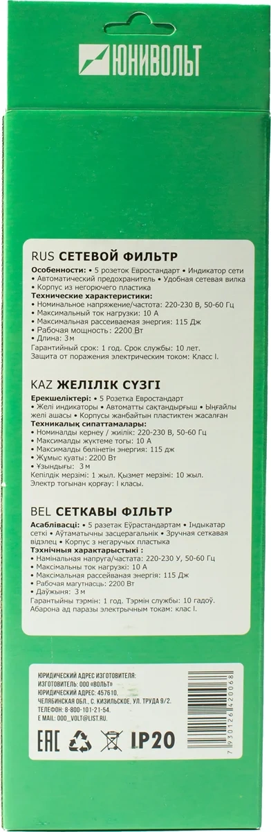Сетевой фильтр Юнивольт 00-00000390 3м (5 розеток) белый (коробка)