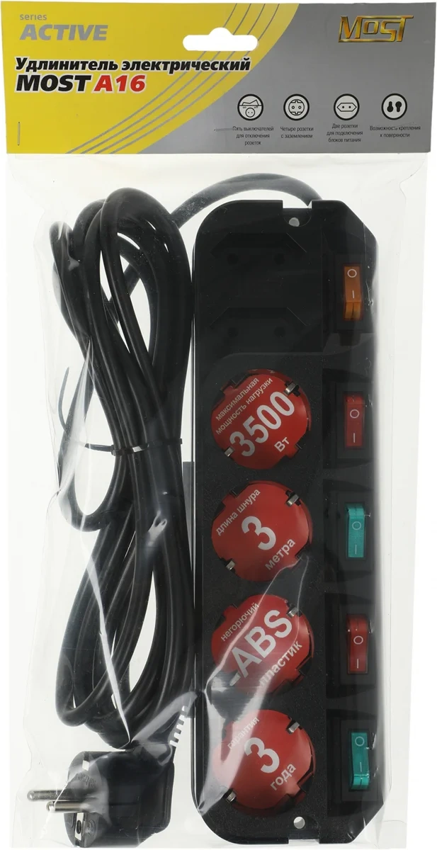 | Особенности | удлинитель most а16 предназначен для подключения бытовой техники к сети электропитания. у каждой из |