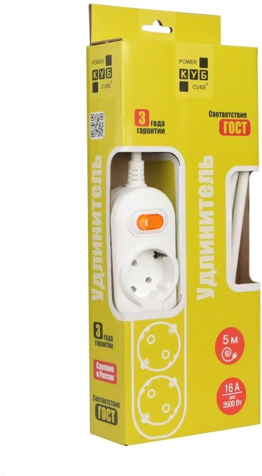 Сетевой удлинитель Powercube PC-1-5M 5м (3 розетки) белый (коробка)