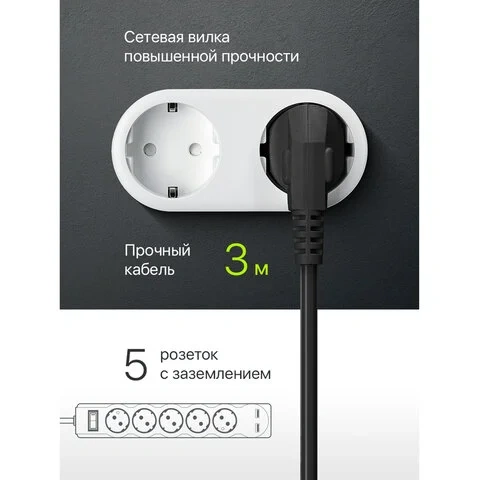 Сетевой фильтр Defender DFS-753 5 розеток, 3м, черный, 2 разъема USB