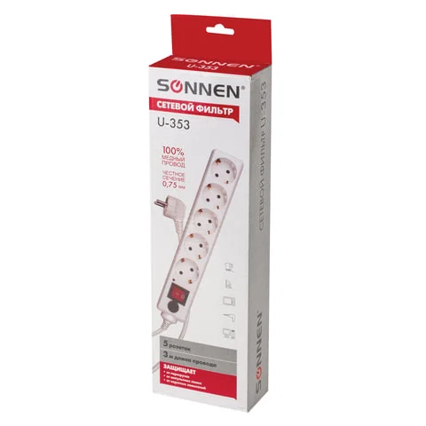 Сетевой фильтр Sonnen U-353 5 розеток, 3м, белый, с заземлением