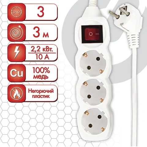Удлинитель сетевой SONNEN U-133G, 3 розетки, c заземлением, 10 А, 3 м, 511432
