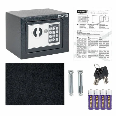 На сейф установлен электронный кодовый замок со световой и звуковой индикацией, позволяющий запрограммировать свой уникальный код (от 4 до 8 знаков). В комплект входит аварийный мастер-ключ на случай, если забыли код или вышли из строя элементы питания. Подробная инструкция по эксплуатации замка в комплекте.