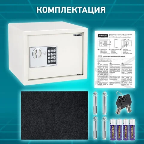 На сейф установлен электронный кодовый замок со световой и звуковой индикацией, позволяющий запрограммировать свой уникальный код (от 4 до 8 знаков). В комплект входит аварийный мастер-ключ на случай, если забыли код или вышли из строя элементы питания. Подробная инструкция по эксплуатации замка в комплекте.