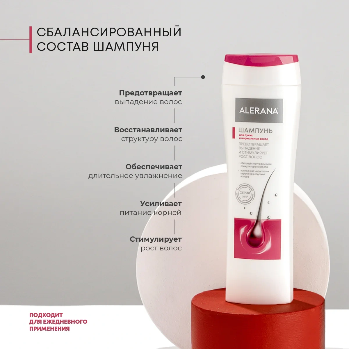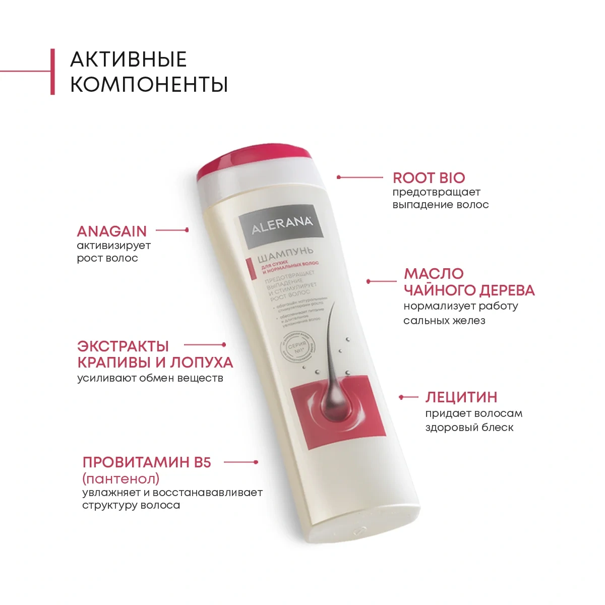 Обогащенный природными активаторами роста шампунь разработан для уменьшения выпадения и стимулирования роста сухих и нормальных волос. Растительные стимуляторы волос AnaGain и RootBio, воздействуют на волосяные фолликулы, улучшают питание корней, активизируют рост волос. Коэффициент роста волос +78%. Уменьшение потери волос на 31%. Специально подобранный комплекс ценных масел (чайного дерева, маковое) и природных экстрактов увлажняет и реставрирует стержень волоса, уменьшает выпадение волос, смягчает кожу головы, облегчает расчесывание и дарит волосам эластичность и здоровый блеск.Результат: блеск и легкое расчесывание без ломкости, расслоения и выпадения.