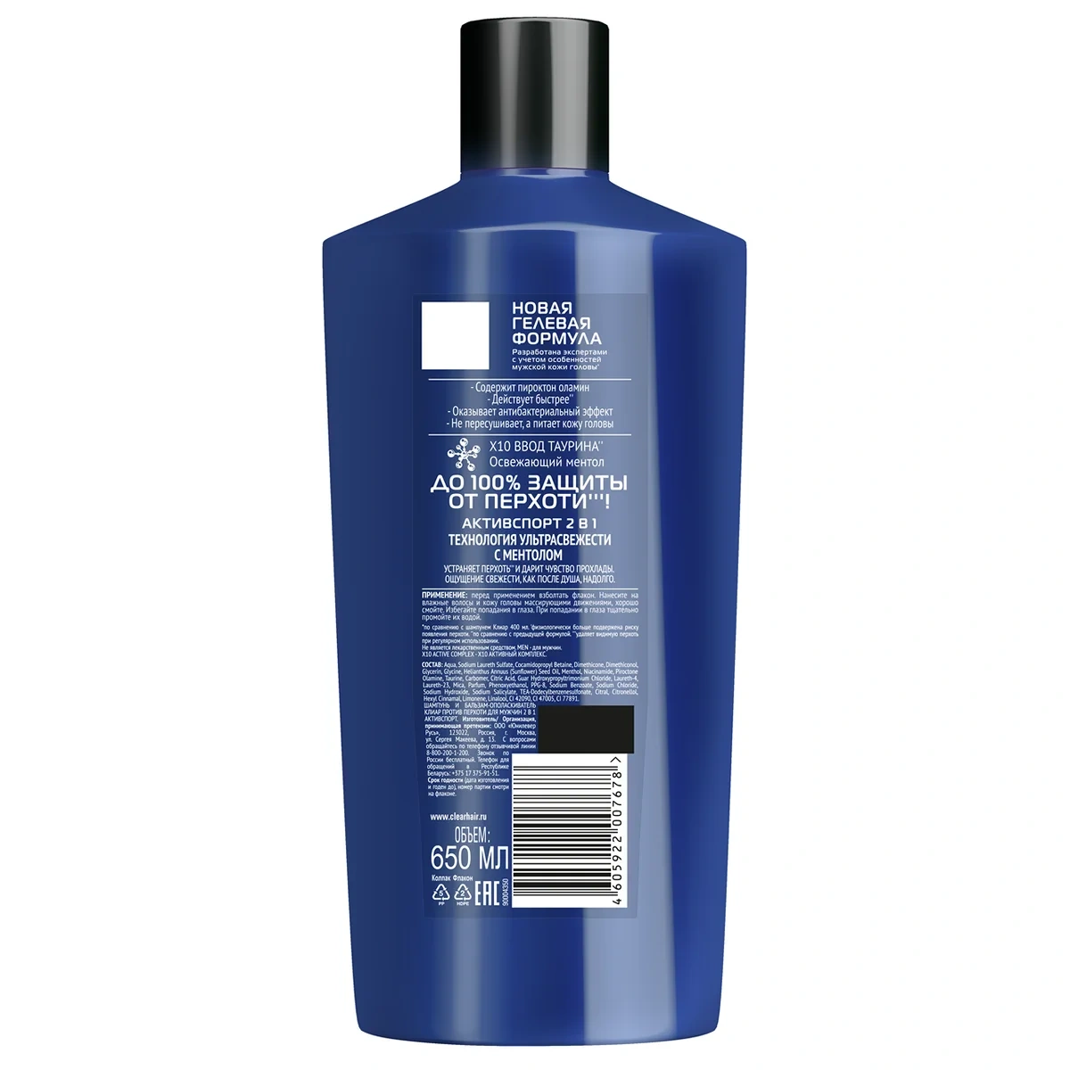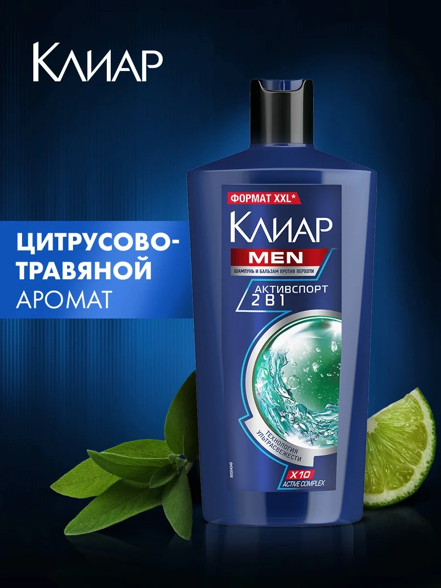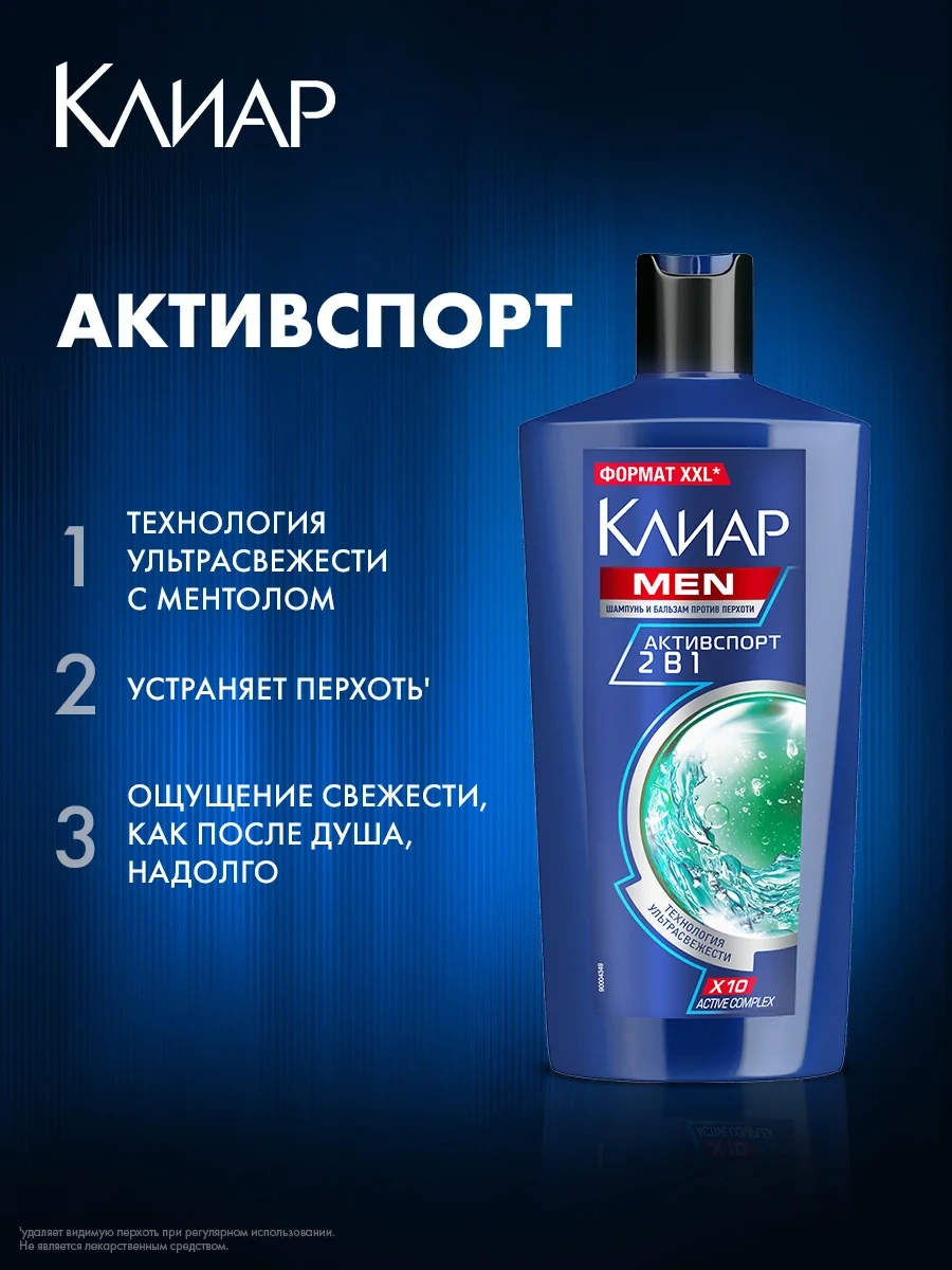 Клиар Активспорт - мужской шампунь и бальзам ополаскиватель для волос 2в1 в XXL формате. Шампунь против перхоти мужской с освежающим ментолом и пироктон оламином эффективно очищает, оказывает антибактериальный эффект и питает кожу головы. Результат: красивые, ухоженные волосы, до 100% защиты от перхоти! Средство обладает легким цитрусово-травяным ароматом. удаляет видимую перхоть при регулярном использовании. Не является лекарственным средством. эффективен в борьбе с жирной и сухой перхотью. Густой продукт образует много пены, которая смывает любые загрязнения с волос и кожи головы. В составе средства - витамины, цинк, масла. Такое трио обновляет эпидермис, регулирует деятельность сальных желез, обладает антивоспалительными, дезодорирующими и противоинфекционными свойствами. Изюминкой средства является яркий мужской аромат, который остается на волосах на длительный срок. Результат курсового применения шампуня - густые, объемные и ухоженные волосы без перхоти.