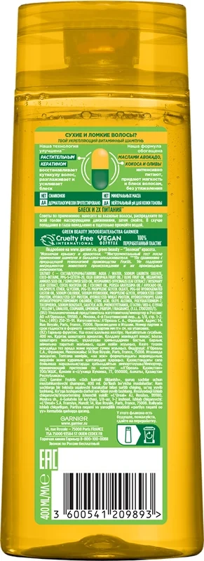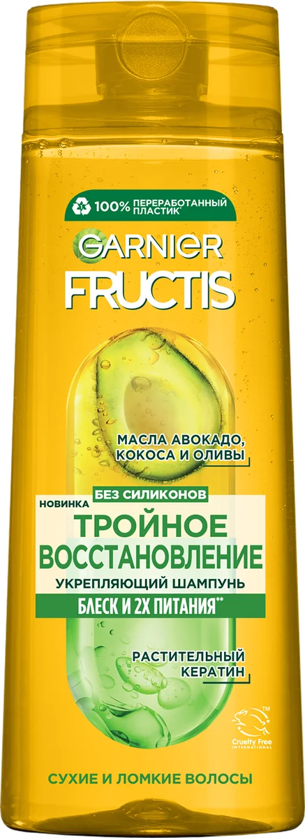 Шампунь Тройное восстановление укрепляющий Fructis – это современное средство, изготовленное на основе концентрата фруктов. 3 масла - 3 действия: масло Оливы против ломкости, масло Авокадо против сухости, масло Карите против тусклости. Средство поможет вернуть здоровый блеск, эластичность и силу поврежденным локонам, укрепляя 'сердце' волоса. Хорошо намочите волосы от корней до кончиков. Нанесите шампунь, аккуратно массируя кожу головы кончиками пальцев. Тщательно промойте волосы.