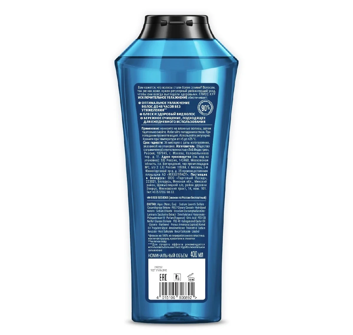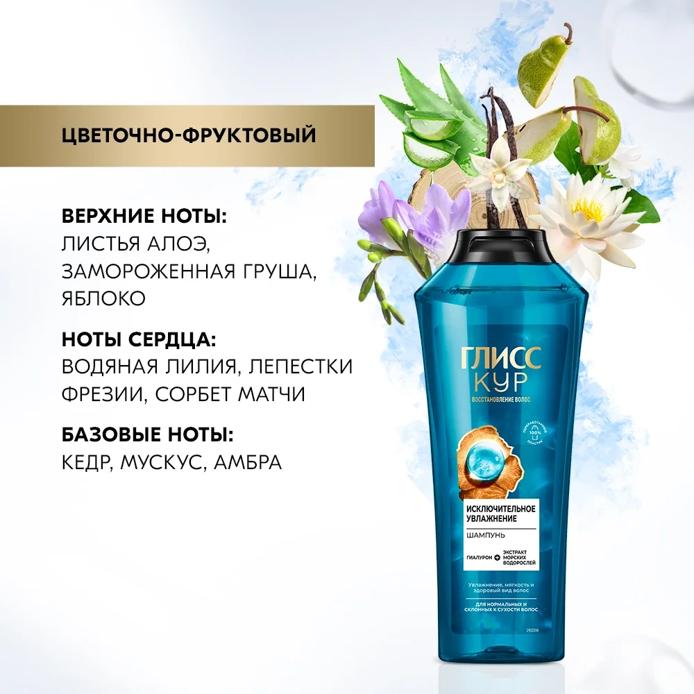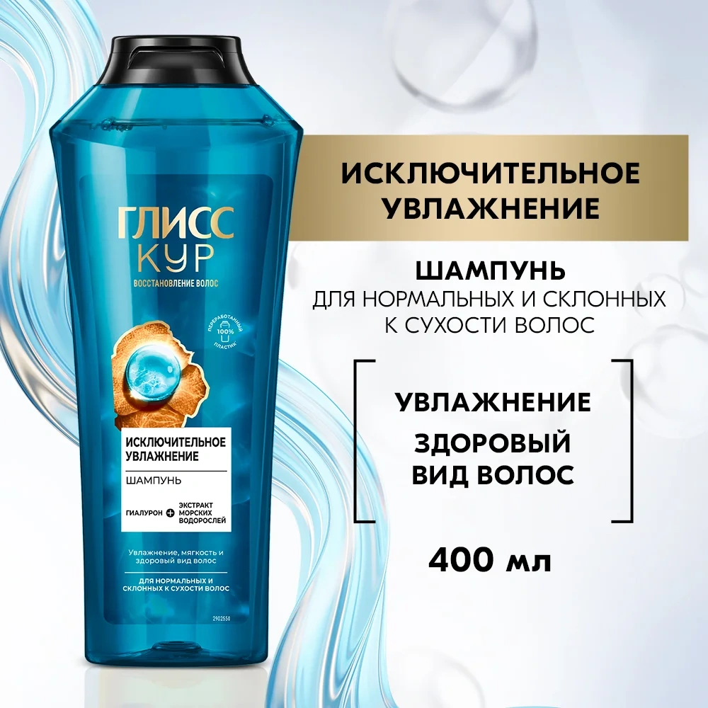 Вам кажется, что волосы стали более сухими? Волосам, так же как коже, нужен регулярный увлажняющий уход, чтобы они всегда выглядели здоровыми. Глисс кур исключительное увлажнение обеспечивает: оптимальное увлажнение волос до 48 часов без утяжеления*; блеск и здоровый вид волос; бережное очищение, подходящее для ежедневного использования. Продукт содержит 90% ингредиентов натурального происхождения (включая воду). * Для лучшего эффекта рекомендуется использовать бальзам Глисс Кур Исключительное увлажнение.