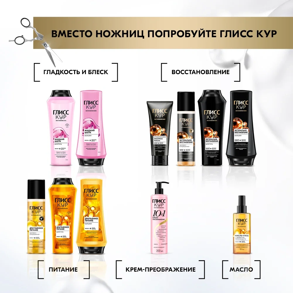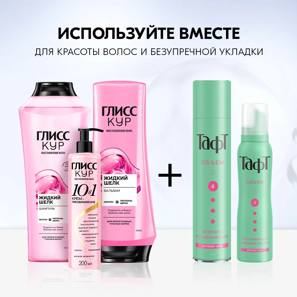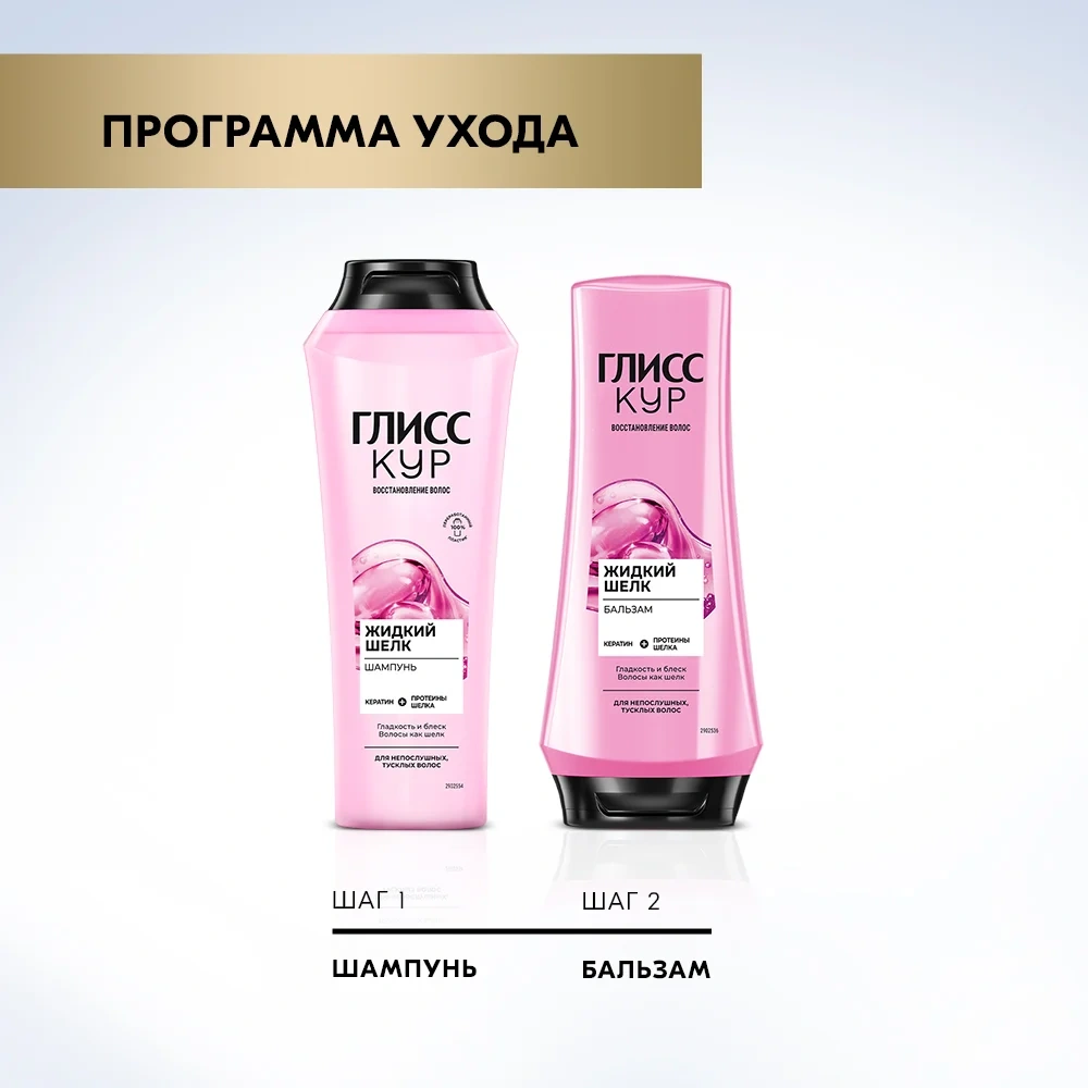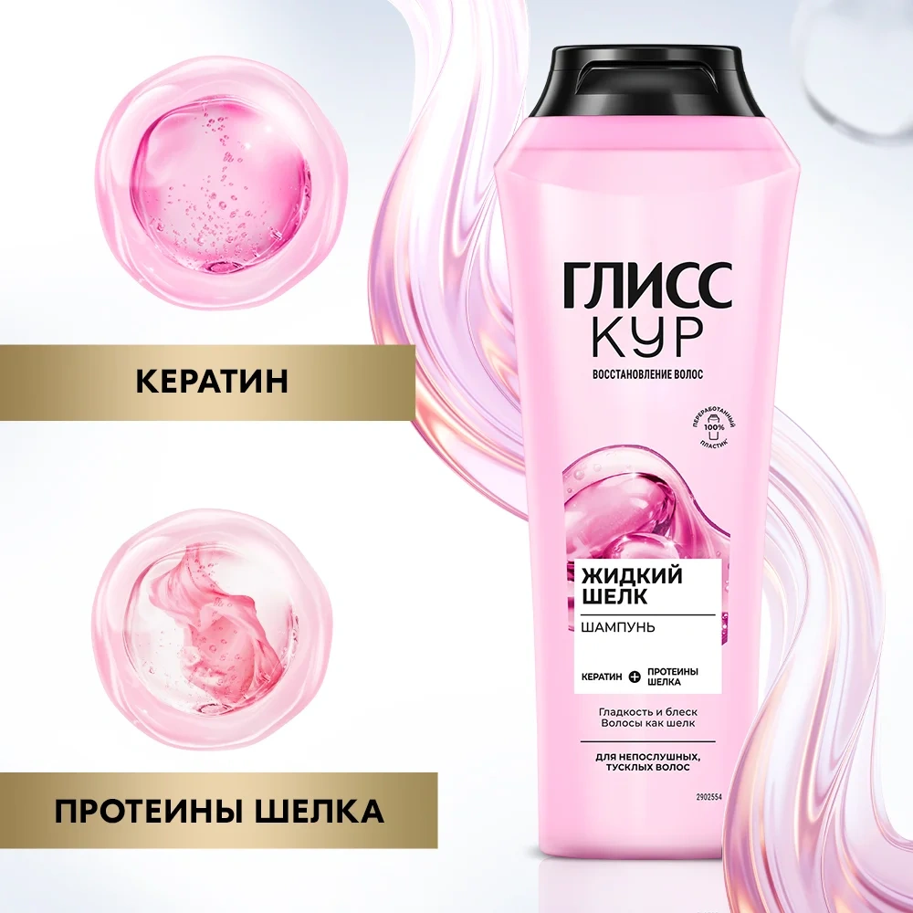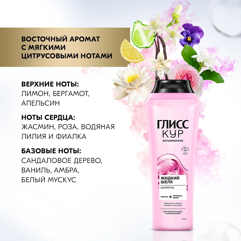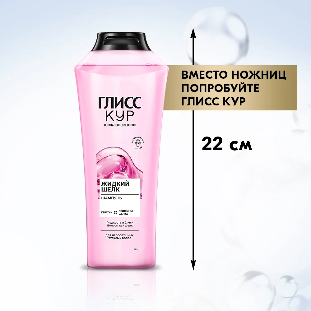 Из-за повреждений волосы становятся непослушными и теряют блеск. Чтобы вернуть им гладкость и шелковистость нужен особый уход за волосами. Глисс Кур женский шампунь для волос Жидкий шелк обеспечивает: эффективное очищение; мягкость волос и блеск; волосы как шёлк. Продукт содержит 91% ингредиентов натурального происхождения (включая воду).
