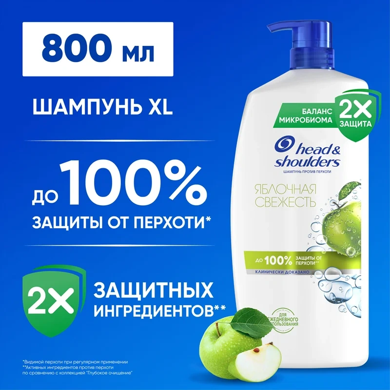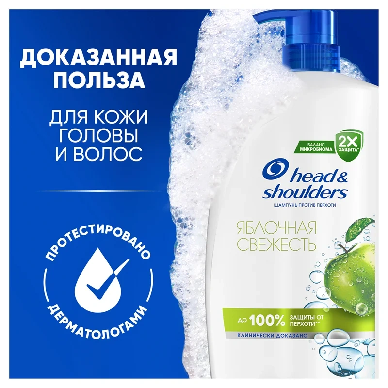 Шампунь против перхоти Head & Shoulders (Хэд энд Шолдерс) с ароматом Яблока подходит для всех типов волос и кожи головы. Обеспечивает до 100% защиты от перхоти*. Эффективен даже против стойкой перхоти. Удобная бутылка с дозатором позволяет наслаждаться любимым шампунем для волос еще дольше и сократить количество отходов. Просто нажмите на дозатор, чтобы начать использование. Обновленная формула с активным ингредиентом Пироктон Оламином удаляет как видимую, так и невидимую перхоть, доставляя в поры в 2Х больше защитных ингредиентов. Клинически проверенная и дерматологически протестированная pH-сбалансированная формула делает волосы и кожу головы чистыми и свежими. Шампунь для мужчин женщин для ежедневного использования с формулой Баланса микробиома устраняет основную причину возникновения перхоти и поддерживает сбалансированный микробиом кожи головы. Увлажняющий шампунь для волос уменьшает проблемы и увлажняет кожу головы, избавляя волосы и кожу от перхоти. Для оптимального результата использовать при каждом мытье головы.
