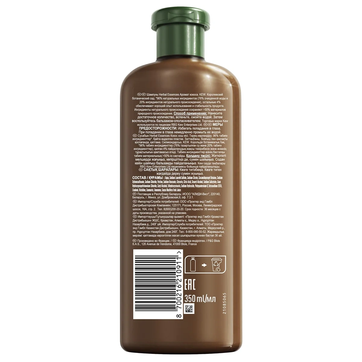 На 90 % состоит из натуральных ингредиентов и включает в себя активный антиоксидант, который способствует бережному очищению и защите ваших волос. Его питательная pH-сбалансированная формула обогащена натуральным сертифицированным кокосовым молоком и другими растительными экстрактами, качество которых одобрено Королевским Ботаническим Садом Кью в Лондоне. Не содержит продуктов животного происхождения. Herbal Essences аттестован международной организацией PETA как Cruelty-Free: вся продукция бренда не тестируется на животных. Для наилучшего эффекта используйте совместно с бальзамом-ополаскивателем Питание и Сила и интенсивной маской и маслом для волос из коллекции Essences of Life.