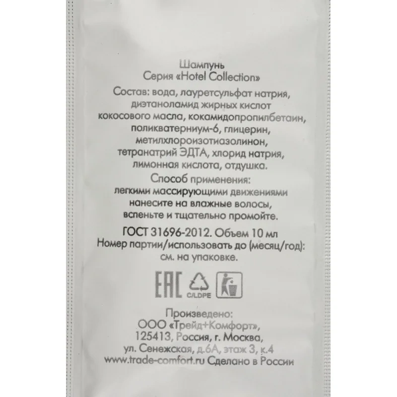 Шампунь для волос, саше 10 мл. Состав: вода очищенная, бензоат натрия, кокосовый диэтаноламид, лауретсульфат натрия SLES, глицерин, растительный экстракт, кокоамидопропил бетаин, хлорид натрия, лимонная кислота, краситель пищевой, парфюмерная композиция. Материал упаковки - триплекс (тресхлойная пленка с металлизированным слоем). Количество в коробе - 500 штук. Срок годности 18 месяцев.