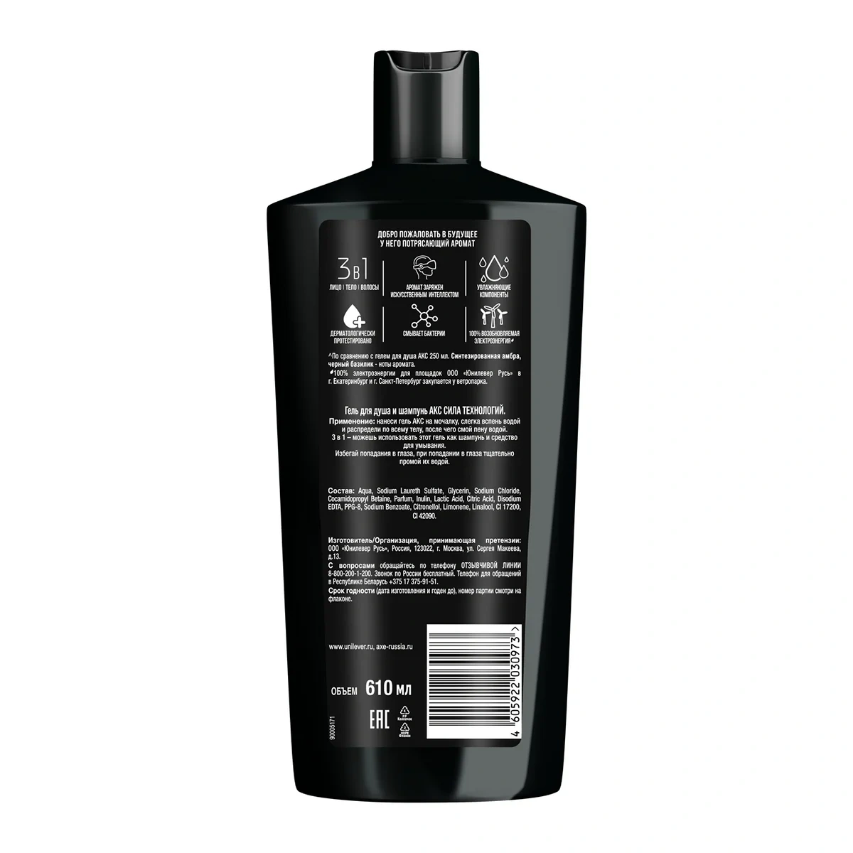Шампунь и гель для душа Акс Сила технологий, 610мл - сила технологий – это результат небольшого эксперимента. В аромате солируют черный базилик, амбра, кориандр и имбирь. Их дерзкий нрав смягчают корица, кашемировое дерево и ваниль. На первый взгляд может показаться, что такая смесь пряностей отлично подойдет для глинтвейна (ну или хотя бы для согревающего травяного чая). Но у этого коктейля из пряных, древесных и сладких нот неожиданно дерзкий, мужской характер. Флакон настолько компактный, что легко поместится в чемодан или в сумку для тренировки. А еще средство может выполнять роль геля для душа, шампуня и средства для умывания.