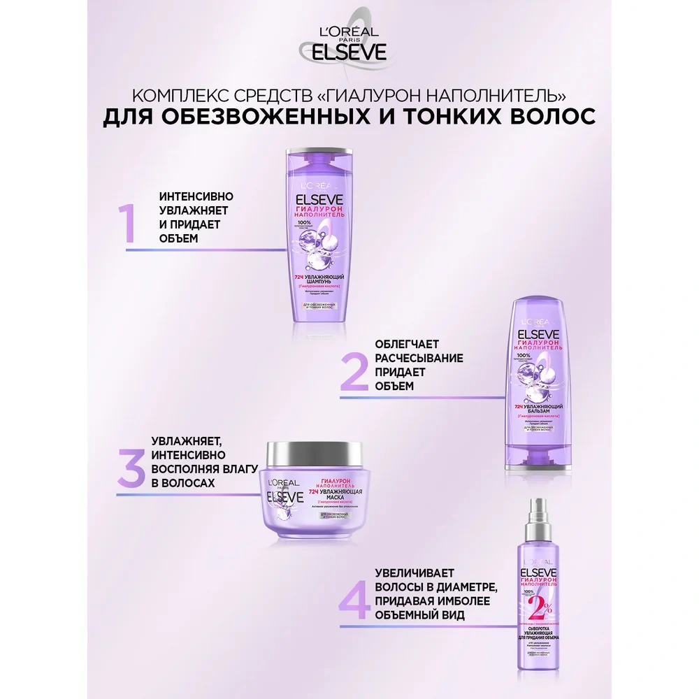 Шампунь Elseve Гиалурон Наполнитель мгновенно преображает обезвоженные волосы, наполняя влагой, делает их блестящими, объемными и упругими без утяжеления. Увлажняющий шампунь обволакивает кутикулу волоса, интенсивно очищая и восстанавливая посредством увлажнения на 72 часа. Волосы в 10 раз более увлажненные, 24 часа сохраняется упругость. После совместного применения шампуня и бальзама волосы выглядят более объемными.