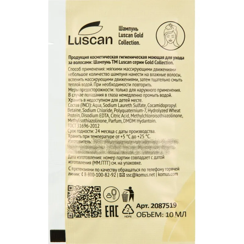Шампунь Luscan Gold Collection 10 мл саше (500 штук в упаковке).Шампунь Luscan Gold Collection глубоко очищает волосы и увлажняет кожу головы, создан специально для ежедневного ухода за волосами.Способ применения: нанесите шампунь на влажные волосы, вспеньте, равномерно распределите массирующими движениями по всей длине, уделяя особое внимание прикорневой зоне. Затем тщательно смойте водой и воспользуйтесь кондиционером или бальзамом.Состав: Aqua, Sodium Laureth Sulfate, Cocamidopropyl Betaine, Sodium Chloride, Polyquaternium-7, Hydrolyzed Wheat Protein, Disodium EDTA, Citric Acid, Methylchloroisothiazolinone, Methylisothiazolinone, Parfum, DMDM Hydantoin.Срок годности: 24 месяца с даты изготовления, указанной на упаковке.Количество в упаковке: поставляется упаковками по 500 саше.