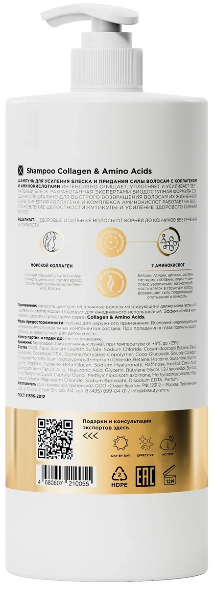 Шампунь для усиления блеска и придания силы волосам с коллагеном и аминокислотами интенсивно очищает, уплотняет и усиливает зеркальный блеск. Разработанная экспертами биодоступная формула создана специально для быстрого возвращения волосам их жизненной силы. Синергия коллагена и комплекса аминокислот работает на восстановление целостности кутикулы и усиление здорового сияния волос. Результат здоровые и сильные волосы от корней до кончиков без сечения и ломкости. Морской коллаген уплотняет, повышает упругость и эластичность, уменьшает статику волос, способствует усилению естественного блеска. 7 аминокислот: бетаин, глицин, аргинин, цистеин, гистидин, глютамин, лизин - комплекс увеличивает жизнеспособность клеток в структуре волоса, возвращает силу, предотвращает спутывание и ломкость.