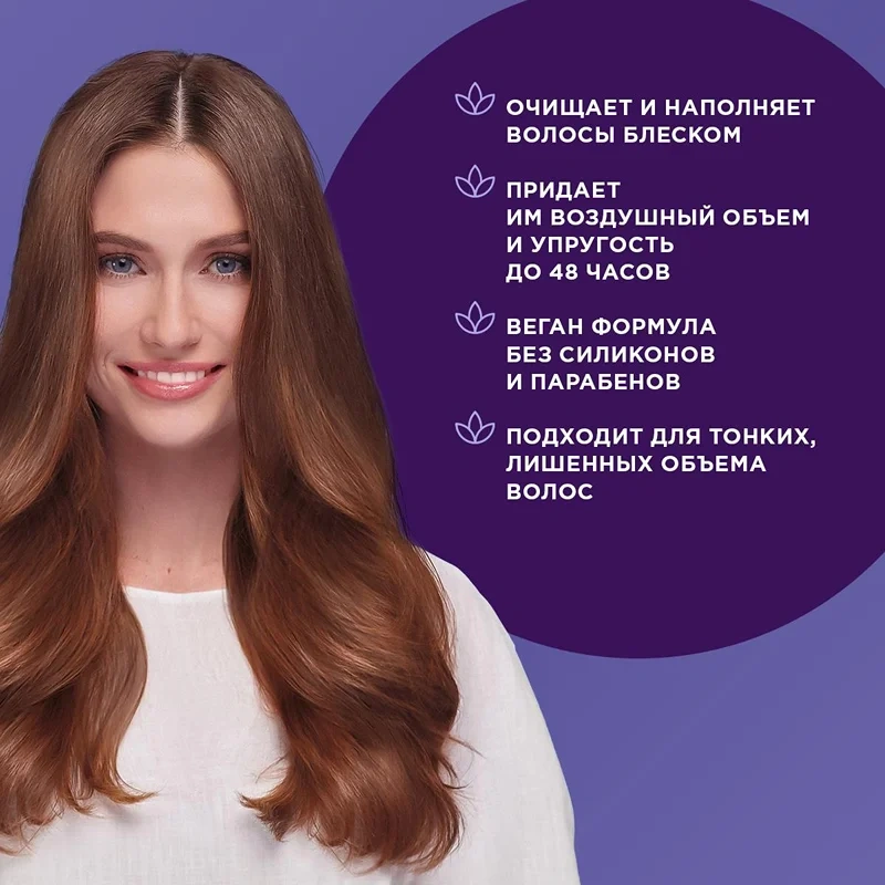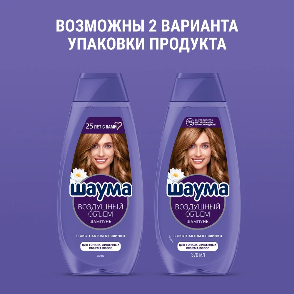 Шаума 370 мл Шампунь Воздушный Объем для тонких, лишенных объема волос: придает до 48 часов воздушный объем и упругость; очищает и наполняет волосы блеском; с экстрактом кувшинки; >90% ингредиентов натурального происхождения*. Веган формула** без силиконов. Подходит для тонких, лишенных объема волос. *Включая воду. **Не содержит ингредиентов животного происхождения.
