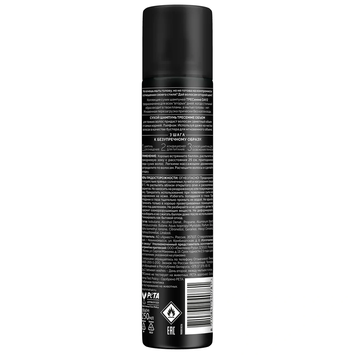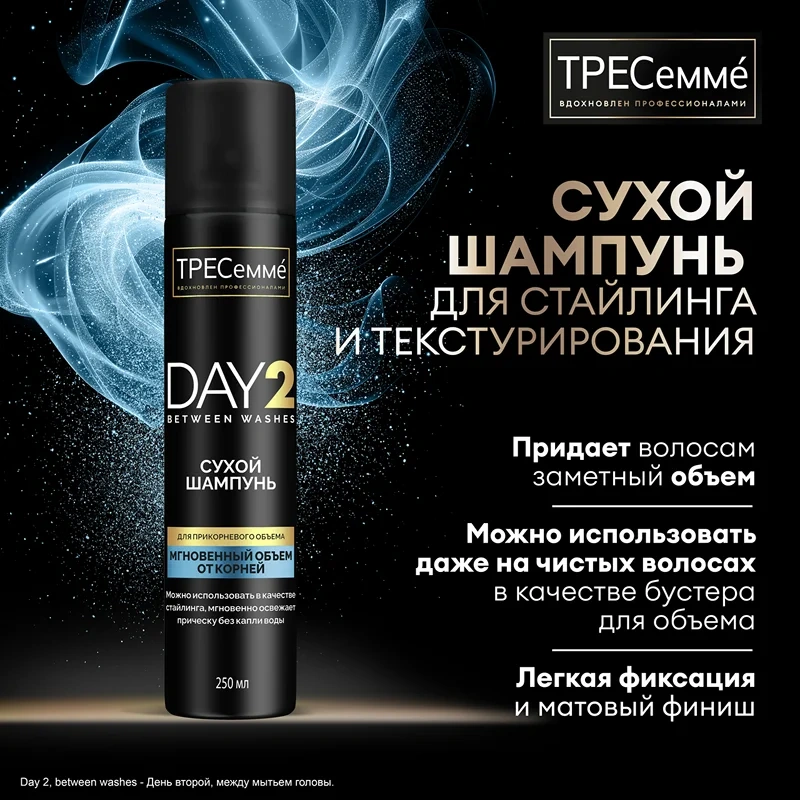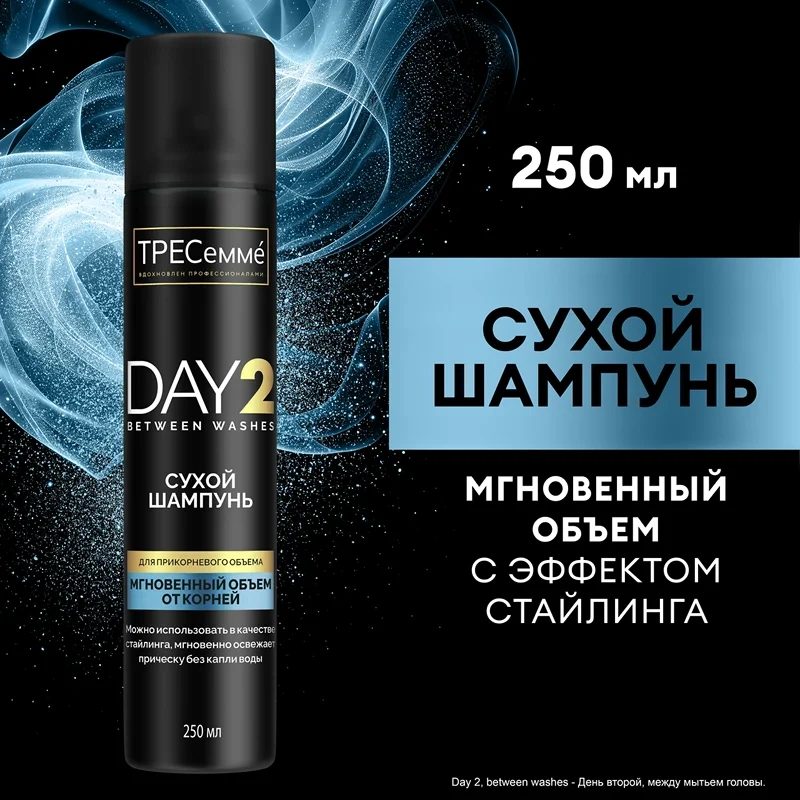 Освежающий сухой шампунь спрей ТРЕСемме - это уходовое средство для прикорневого объема. Шампунь сухой для тонких волос - это мгновенная перезагрузка прически и укладки без капли воды. Можно использовать как стайлинг, а также, как бустер мгновенного объема на чистых волосах. Сухой шампунь ТРЕСемме для объема у корней волос мгновенно освежает прическу. ТРЕСемме шампунь для волос - это продукт, вдохновленный профессионалами. Объем средства 250мл. Это отличное решение в случаях, когда мытье головы не входит в планы, но при этом необходимо быстро создать стильный образ. С помощью этого средства можно кардинально преобразить прическу всего за несколько минут, не используя воду. Средство обладает консистенцией пенки, не утяжеляет и не склеивает волосы, подходит для любого типа кожи головы. Day 2 Volumising Dry Shampoo предназначен для ухода за нормальными и жирными волосами. Удобный дозатор обеспечивает экономичный расход средства.