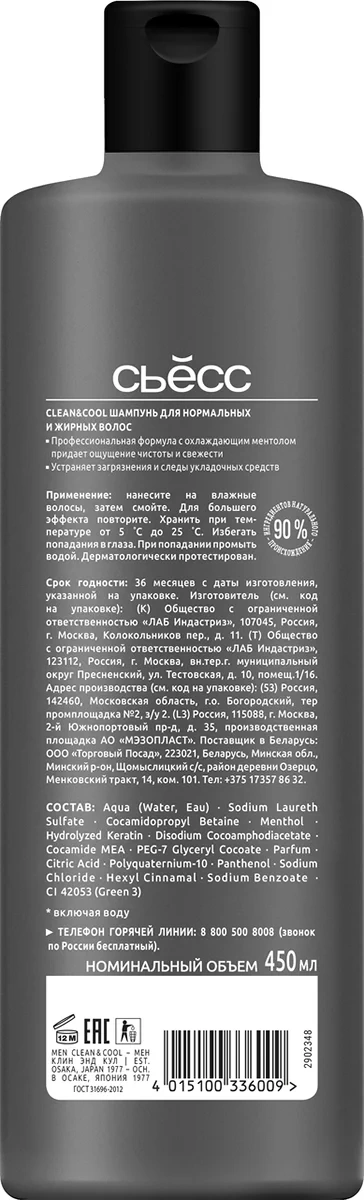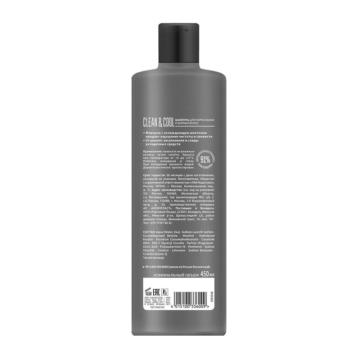 Шампунь Сьёсс Men Clean & Cool для нормальных и жирных волос, глубокое очищение, 450мл