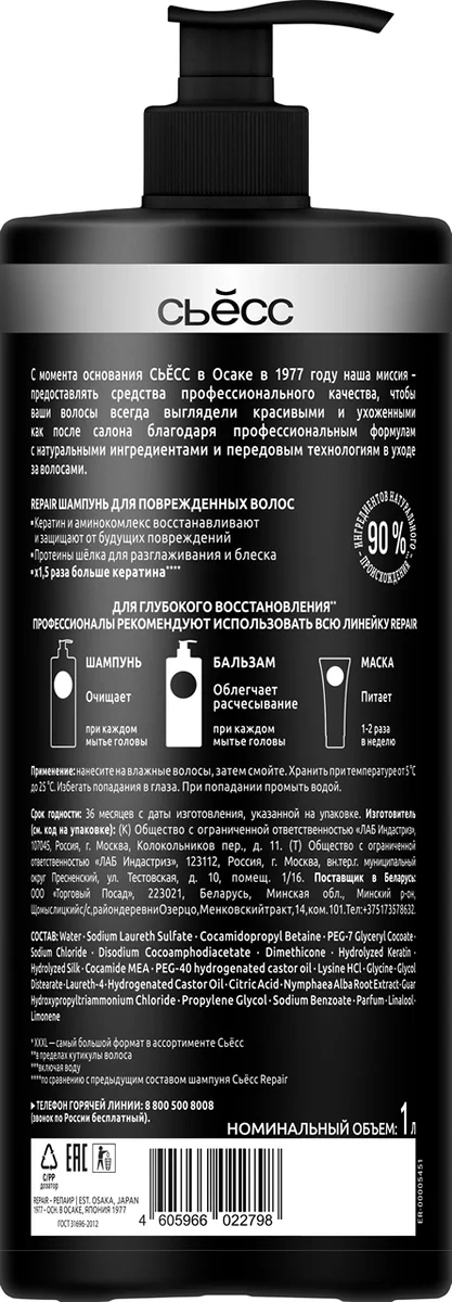 Шампунь Сьесс Repair: профессиональный уход для сухих и повреждённых волос Ищете профессиональное средство для интенсивного ухода за сухими и повреждёнными волосами? Попробуйте шампунь Сьесс Repair. Он подходит для женщин, которые хотят вернуть своим волосам жизненную силу и красоту. Почему стоит выбрать этот шампунь? Профессиональный уход. Формула шампуня разработана профессионалами специально для интенсивного восстановления сухих и повреждённых волос. Интенсивное восстановление. Регулярное использование шампуня помогает восстановить структуру волос, делая их более сильными и упругими. 1. Интенсивная формула с кератином и аминокомплексом 2. Восстанавливает и защищает от будущих повреждений 3. Запечатывает секущиеся кончики 4. С экстрактом водяной лилии Выгодная покупка. Большой формат выпуска - 1 литр - это ощутимая выгода для вашего кошелька. Вы сможете наслаждаться красивыми и здоровыми волосами дольше, не беспокоясь о покупке нового шампуня. Для достижения максимального эффекта рекомендуется использовать шампунь вместе с другими средствами по уходу за волосами от Сьесс - маской, бальзамом или спреем. Они помогут усилить действие шампуня и обеспечить вашим волосам комплексный уход.