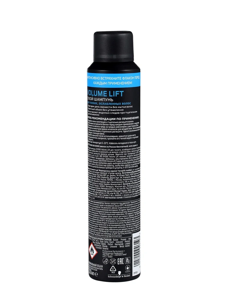 Сухой шампунь Сьёсс Volume Lift для тонких ослабленных, волос с технологией лифтинг-эффект. Продлит свежесть волос без мытья и придаст заметный объем без утяжеления. Еще один день свежести без мытья волос. Заметный объем без утяжеления. Не оставляет видимых следов при тщательном расчесывании.