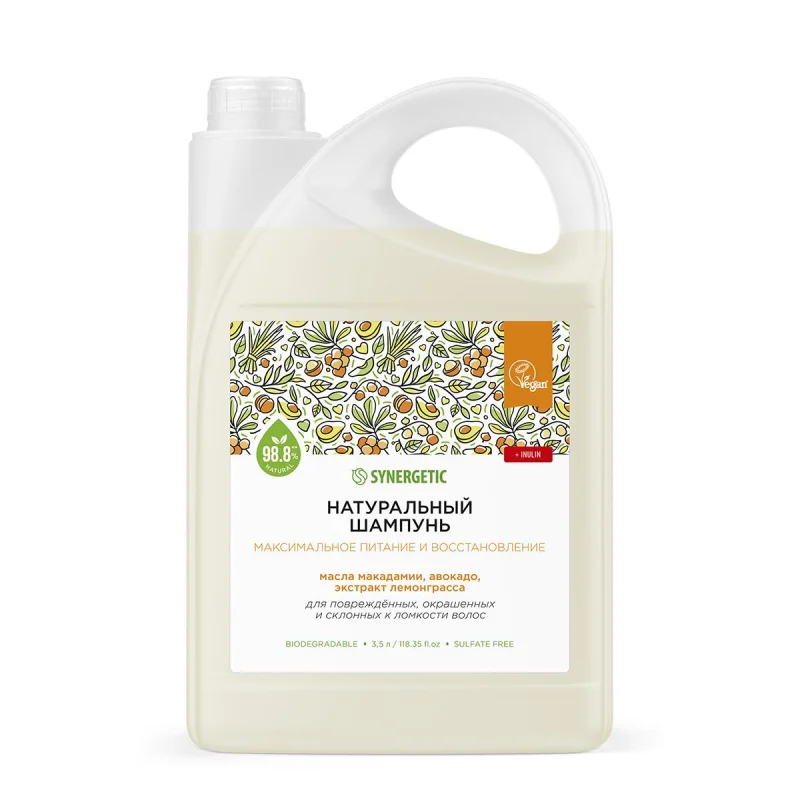 Бессульфатный шампунь Synergetic 'Максимальное питание и восстановление' — эффективное средство для очищения кожи головы и поврежденных, окрашенных, склонных к ломкости волос — более чем на 98% состоит из натуральных компонентов.