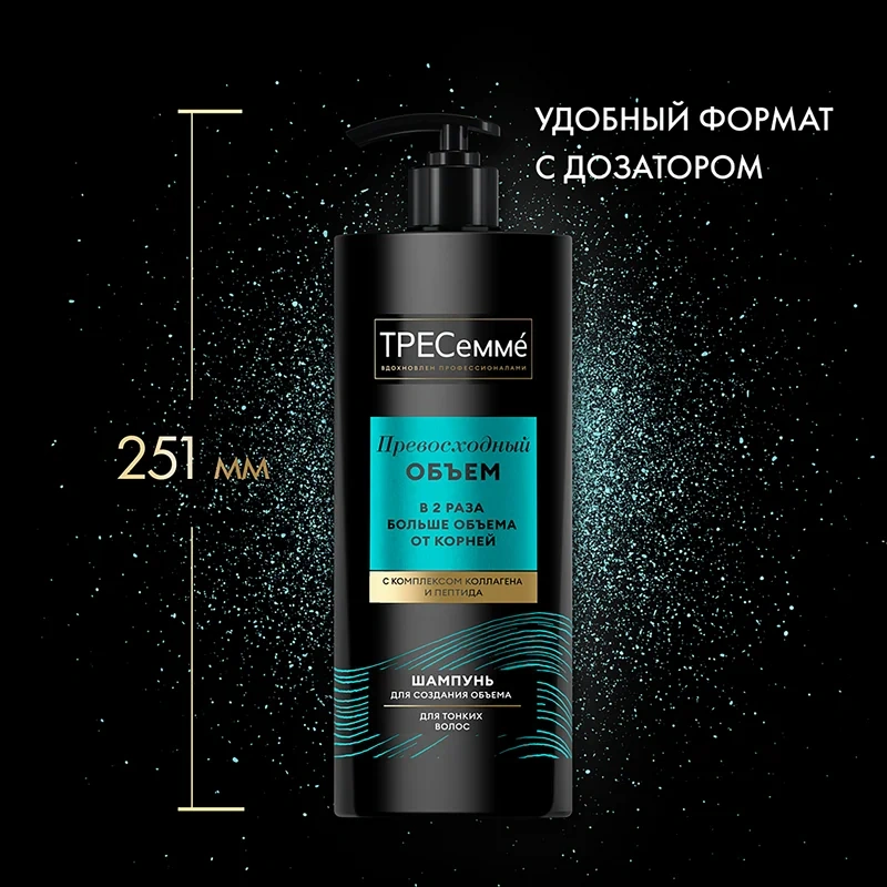 ТРЕСемме Превосходный объем - шампунь для объема волос, обогащенный комплексом коллагена и пептида. Шампунь мягко очищает волосы и кожу головы, оказывает ухаживающее действие и обеспечивает видимый результат: в 2 раза больше объема от корней. Шампуня в большом объеме 1л хватит надолго: каждый день наслаждайтесь объемными, блестящими и ухоженными волосами. Средство обладает мягкой, приятной консистенцией, эффективно и удобно в использовании. Шампунь деликатно очищает локоны и кожу головы от загрязнений, жирности и остатков укладки, делает пряди более упругими, струящимися и эластичными, одновременно придавая волосам в 2 раза больше объёма от самых корней. Специально разработанная инновационная формула линейки Beauty-full Volume с уникальным добавлением коллагена и мицеллярной технологии обеспечивает ощутимый объём на волосах любой длины.