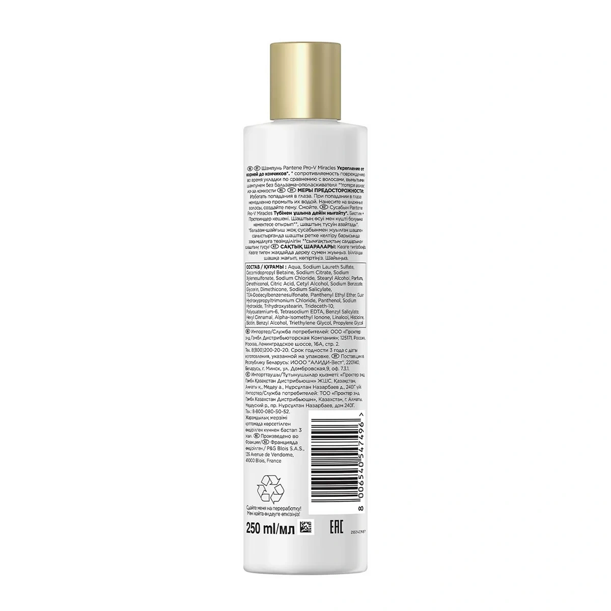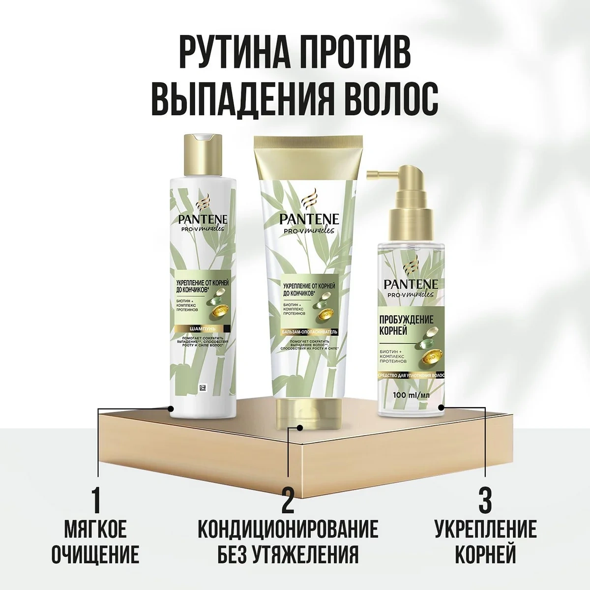 Это высокопитательная формула Pro-V для волос, которые нуждаются в чуде. Коллекция 'Укрепление от корней до кончиков', созданная специально для ломких, тонких и ослабленных волос, сочетает в себе силу уникального комплекса Pro-V с экстрактом бамбука и биотином для силы, роста и густоты волос. Шампунь Рantene Pro-V Miracles Укрепление от корней до кончиков мягко очищает и укрепляет волосы, помогая уменьшить выпадение волос из-за ломкости. Для достижения максимального эффекта используйте в сочетании с бальзамом-ополаскивателем и маской для волос; дополните уход кремом-реконструктором и средством для утолщения волос из серии Укрепление от корней до кончиков. Упаковка шампуня Pantene Pro-V Miracles Укрепление от корней до кончиков на 25% состоит из переработанного пластика и подлежит вторичной переработке (кроме крышки). Формула Pro-V протестирована специалистами Швейцарского Института Витаминов (Swiss Vitamin Institute).