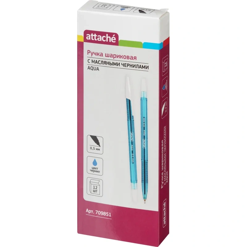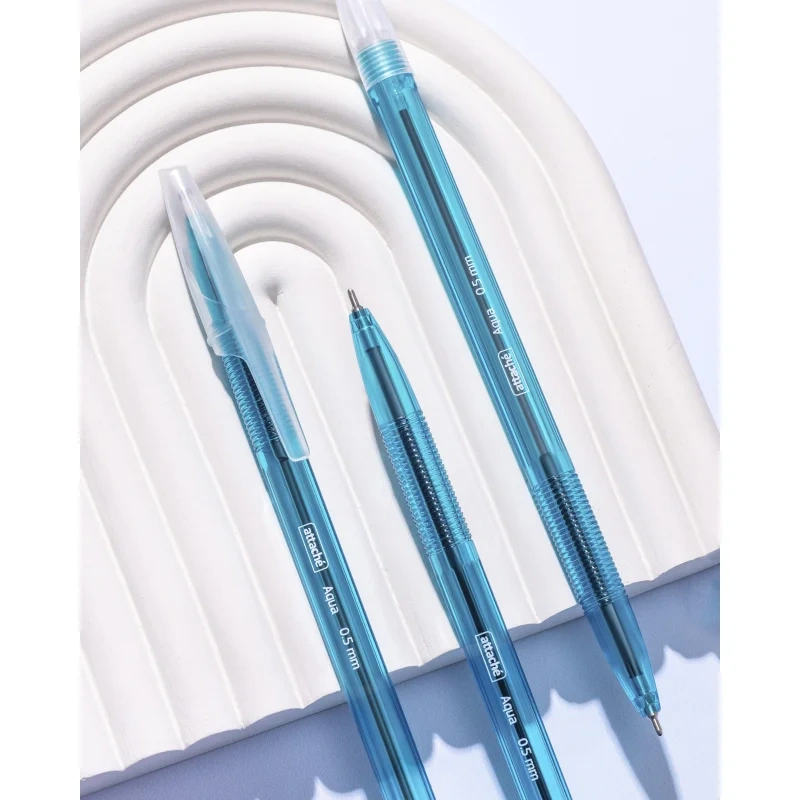 Модель корпуса изготовлена из прозрачного пластика голубого цвета, имеет граненую форму. Снабжена вентилируемым колпачком и наконечником белого цвета. Сменный стержень длиной 142 мм снабжен игольчатым наконечником заправлен высококачественными синими чернилами на масляной основе. Диаметр пишущего узла 0,7 мм создает тонкую линию письма, равную 0,5 мм. Ручка Attache Aqua идеально подойдет для каждодневного использования.