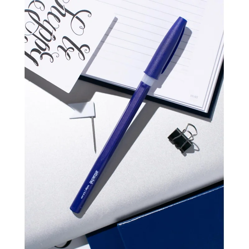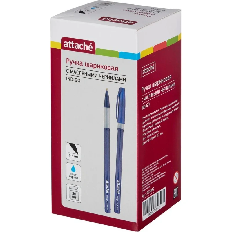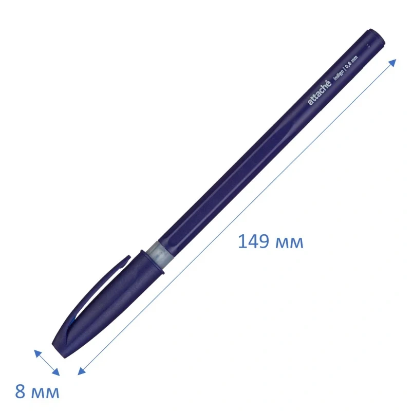 Модель корпуса изготовлена из пластика синего цвета, имеет фигурную форму. Сменный стержень длиной 135 мм снабжен игольчатым наконечником заправлен высококачественными чернилами на масляной основе синего цвета. Резиновая манжетка способствует надежному захвату пальцев и препятствует выскальзыванию. Диаметр пишущего узла 0,7 мм создает тонкую линию письма, равную 0,6 мм. Ручка Attache Indigo — это отличный вариант для ежедневного использования в офисе или дома.