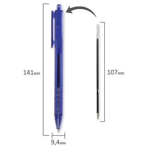 Ручка с круглым корпусом и рифлением в области захвата для удобства письма. Сменный стержень длиной 107 мм, игольчатый наконечник. Диаметр пишущего узла 0,7 мм создает тонкую линию письма 0,35 мм. Лаконичный дизайн соотвествует офисному стилю. Цвет чернил - синий.