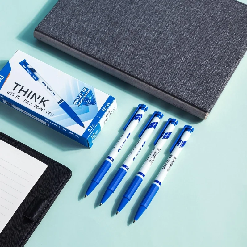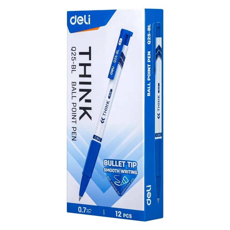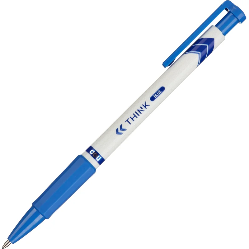 Ручка синяя шариковая автоматическая Deli Think с диаметром пишущего узла 0,7 мм. Мягкая каучуковая подушечка предотвратит скольжение пальцев при письме. Цвет