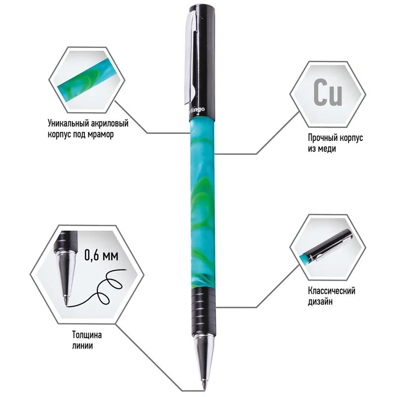 Для ярких, неординарных личностей прекрасно подойдёт шариковая ручка Berlingo Fantasy. Она станет отличным подарком для людей, которые любят выражать свою индивидуальность – достаточно взглянуть на её необычный дизайн. Акриловый корпус создаёт эффект «под мрамор», а сочетание бирюзового, зеленого и черного цветов – контраст. Металлический грипп имеет рифление, что делает его нескользящим. На колпачке имеется хромированный клип, который позволит закреплять ручку где потребуется и работать комфортно. Изделие можно использовать для любого стиля письма, потому что пишущий узел оставляет линию толщиной 0,5 мм. Ручка Berlingo Fantasy упакована в стильный подарочный футляр.