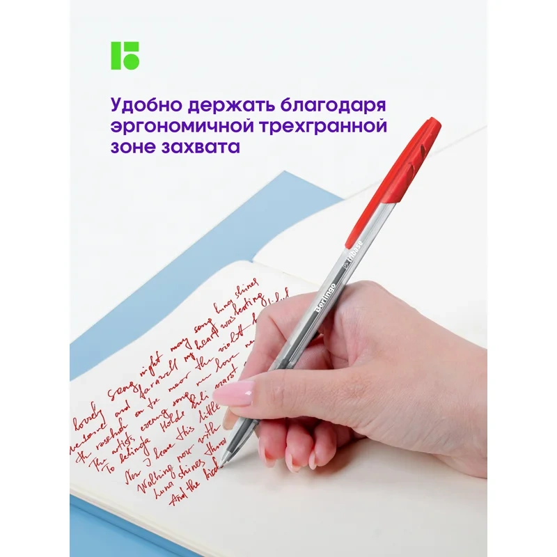 Универсальная шариковая ручка Berlingo Tribase с красными чернилами в прозрачном корпусе с колпачком, который обеспечивает безопасность при использовании детьми, станет простым, но незаменимым помощником в работе и учёбе. Пластиковый клип позволит разместить ручку где удобно. Эргономичная трёхгранная зона захвата с рифлением препятствует скольжению пальцев. Цвет деталей соответствует цвету чернил. Качественные чернила обеспечивают чёткое и ровное письмо. Диаметр пишущего узла составляет 1 мм, благодаря чему ручка идеально подходит для быстрого стиля письма.